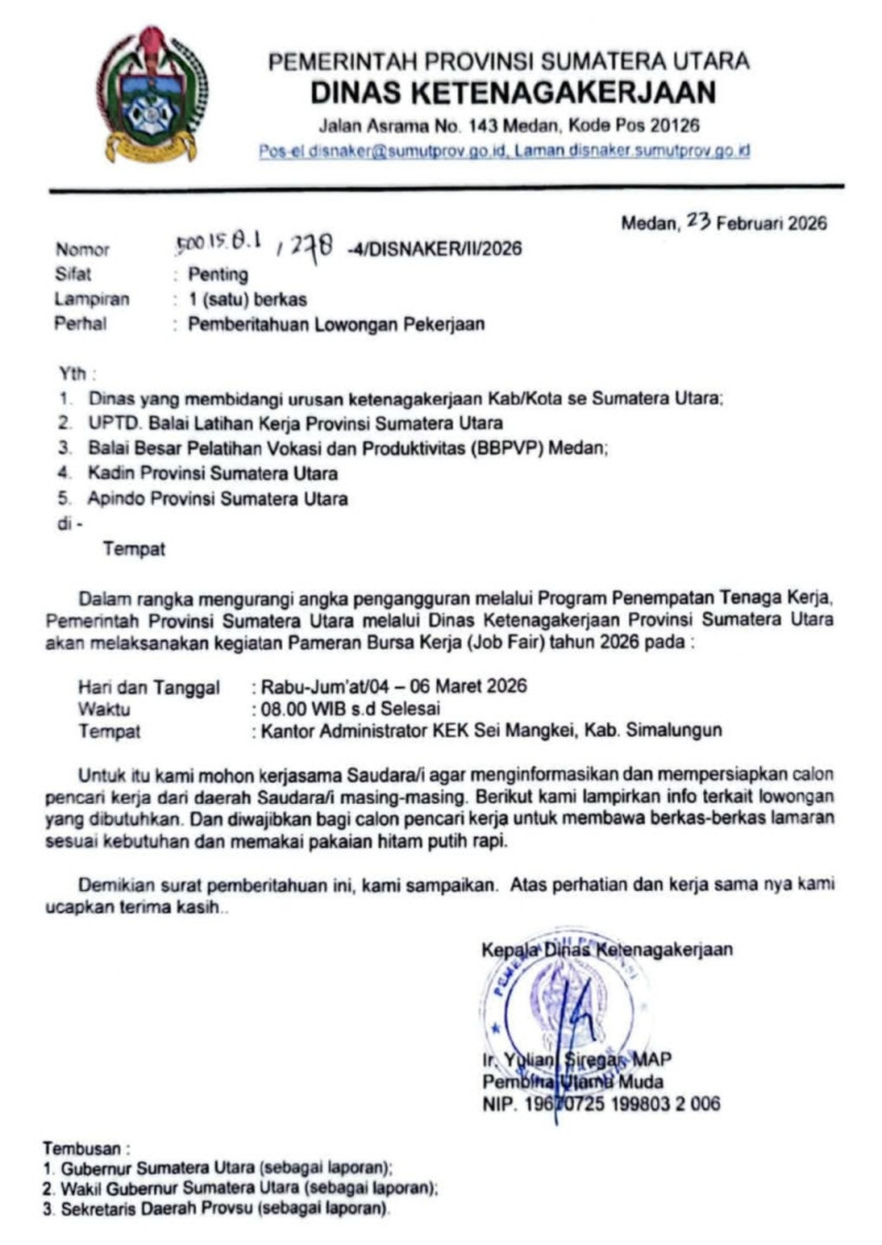 “Dalam rangka mengurangi angka pengangguran melalui Program Penempatan Tenaga Kerja, Pemerintah Provinsi Sumatera Utara melalui Dinas Ketenagakerjaan Provinsi Sumatera Utara akan melaksanakan kegiatan Pameran Bursa Kerja (Job Fair) Tahun 2026,” demikian kutipan surat tersebut.