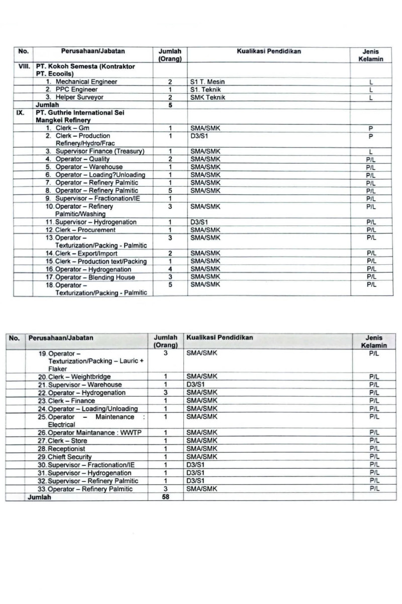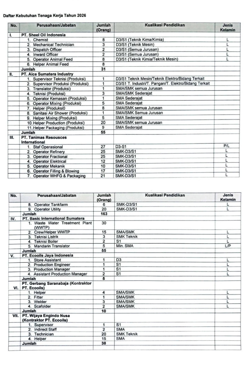 Lowongan yang tersedia mencakup berbagai posisi strategis dan teknis, seperti Mechanical Engineer, Surveyor, Finance & Treasury Supervisor, Operator Loading–Unloading, Operator Refinery, Clerk, Production/Packaging, Water Treatment Plant (WWTP), hingga Production Engineer.